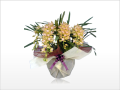 寒さをものともせず咲き誇る明るいオレンジは、まさに冬の太陽。『シンビジューム4本立(オレンジ)アーチ』は胡蝶蘭と同じランの一種で、洋蘭の中で最も寒さに強いお花です。お手入れがしやすくお花の寿命が長いという特徴に加え、胡蝶蘭に引けを取らない豪華さから冬の間は胡蝶蘭に代わってお祝いのシーンを彩ることが多くなります。ひとつひとつのお花の大きさは5~6センチと小ぶりですが、高さは約70センチと立派なもの。申し分ない存在感から、当店でも冬季寒冷地へのご配送をご希望の方にはご検討をおすすめしております。